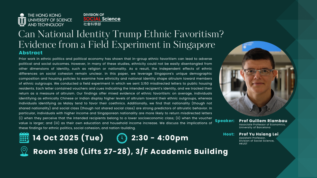 Host: Prof Yu Hsiang Lei, Assistant Professor, Division of Social Science, HKUST